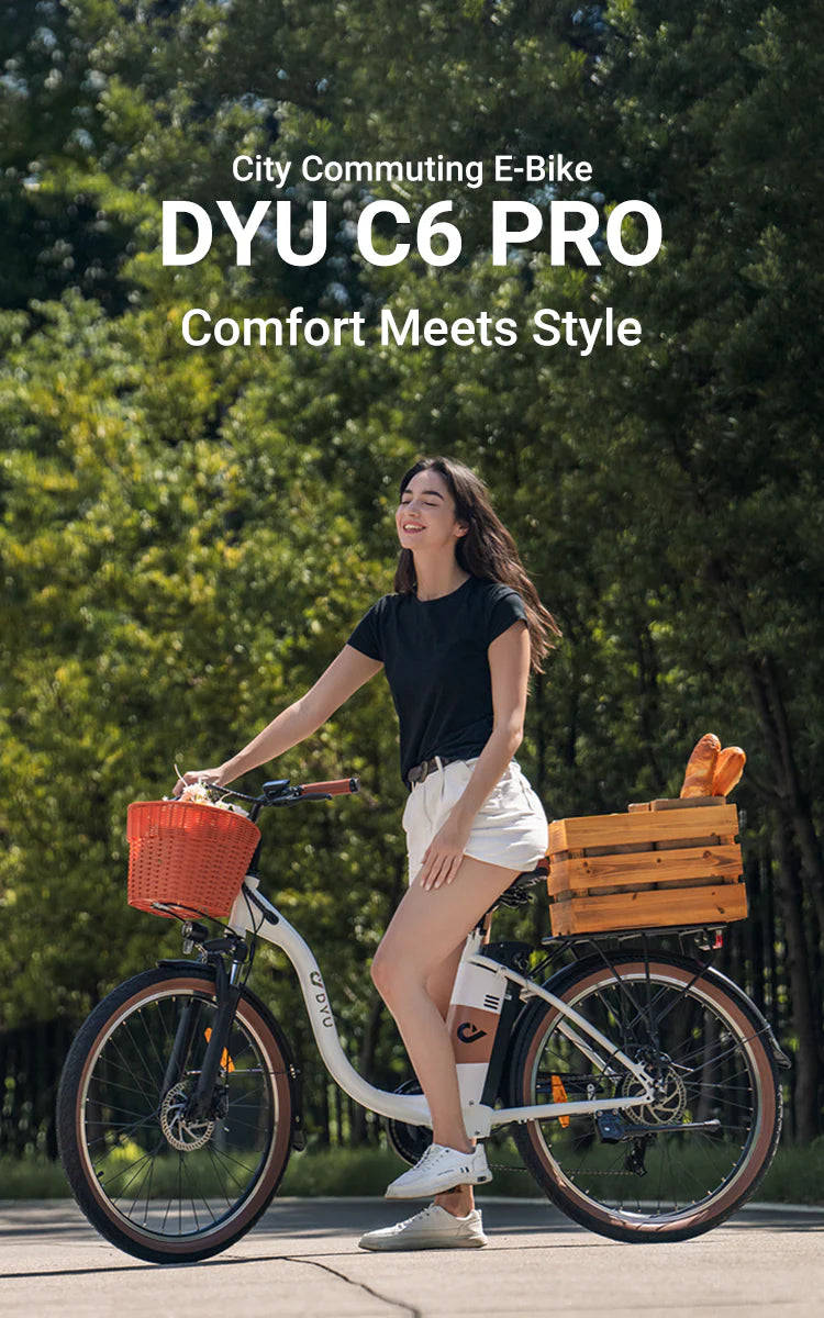 La DYU C6 Pro è una bici elettrica elegante e pratica progettata per la guida cittadina di tutti i giorni. Con il suo telaio step-through di ispirazione vintage, la comoda geometria di guida e la potente combinazione motore-batteria, è l'ideale per gli spostamenti quotidiani, le corse scolastiche o i piacevoli viaggi del fine settimana. Combinando affidabilità, comfort e sicurezza, la C6 Pro offre un valore fantastico sia ai ciclisti nuovi che a quelli esperti di e-bike.