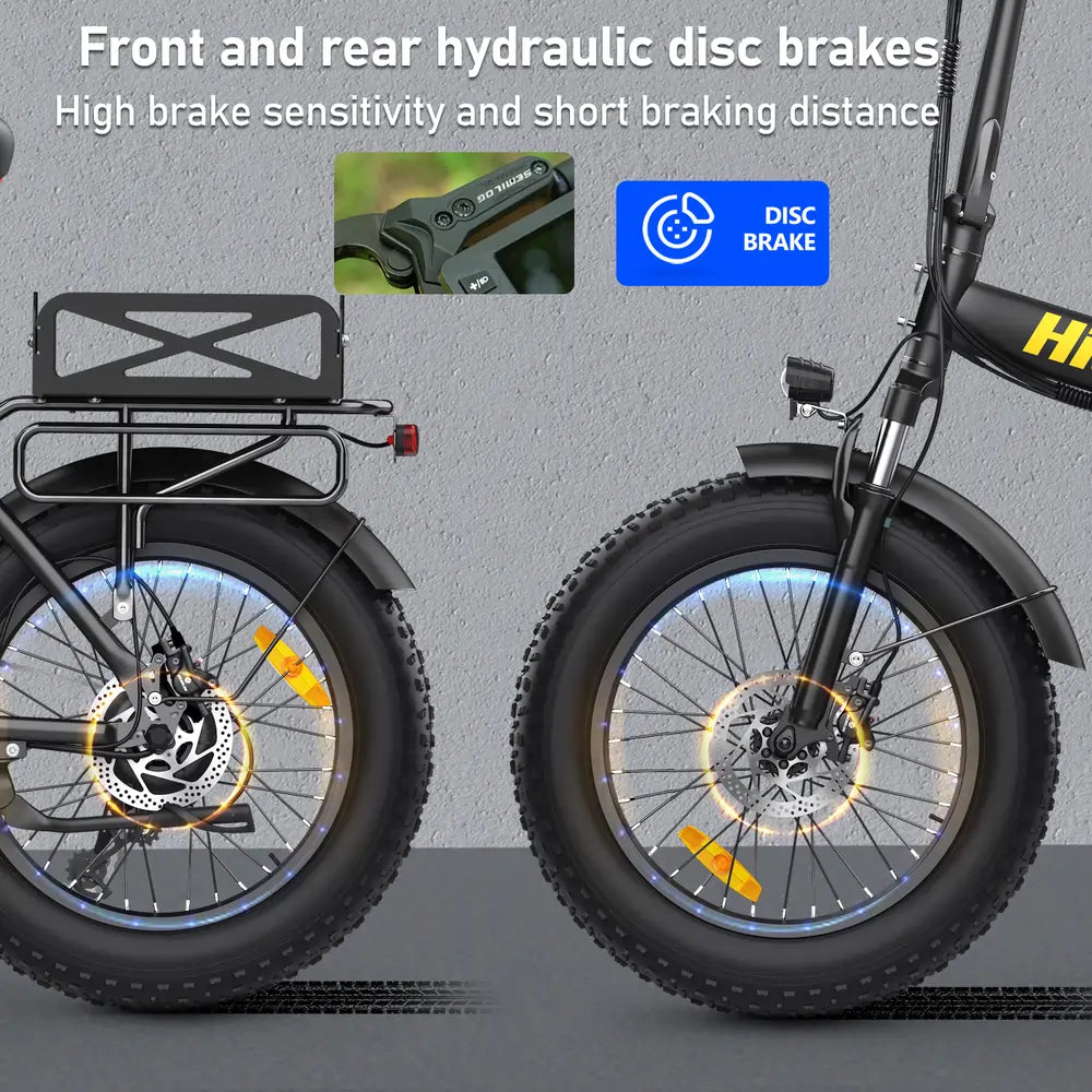 Dotata di pneumatici grassi da 20″ × 4.0″, la bici offre trazione e stabilità eccellenti su terreni diversi. La doppia sospensione (forcella anteriore + ammortizzatore posteriore) assorbe gli urti e i freni a disco su entrambe le estremità garantiscono una potenza frenante affidabile.