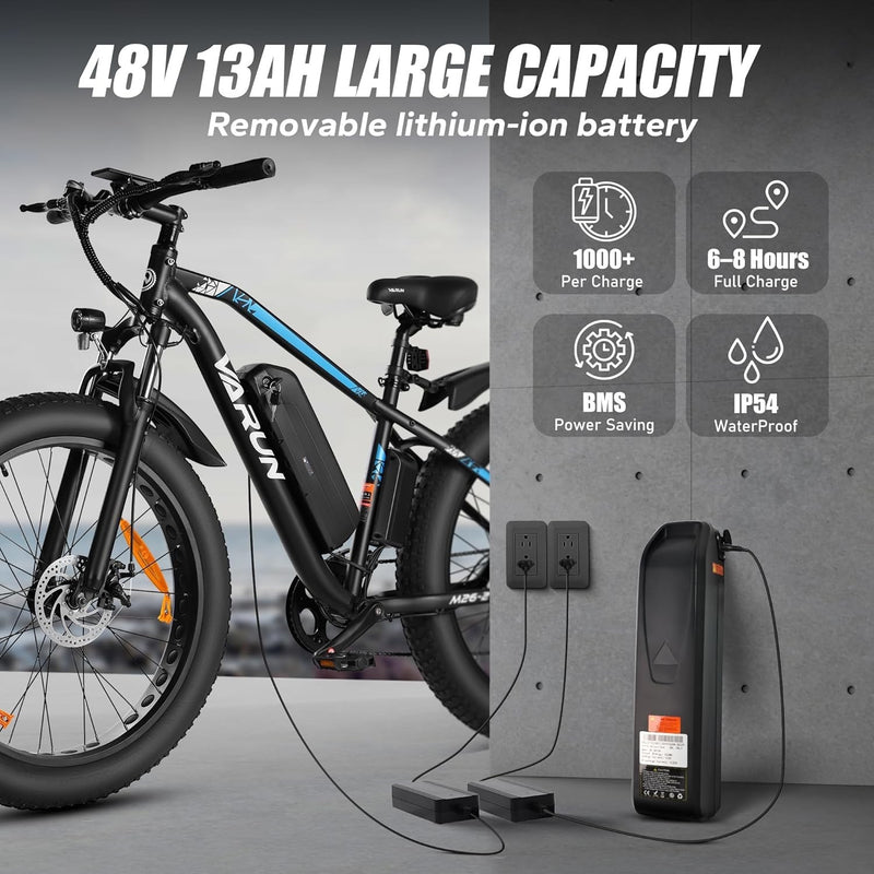 The Varun M26 Pro Fat Tire Electric Bike is a well-regarded e-bike known for its powerful performance and all-terrain capabilities, making it an excellent choice for riders who want to tackle a variety of surfaces. Its robust construction, dual suspension, and fat tires are frequently highlighted as key features that provide a comfortable and stable ride. With a long-range battery and a responsive motor, this bike offers a great balance of power and endurance for both daily commutes and adventurous rides.