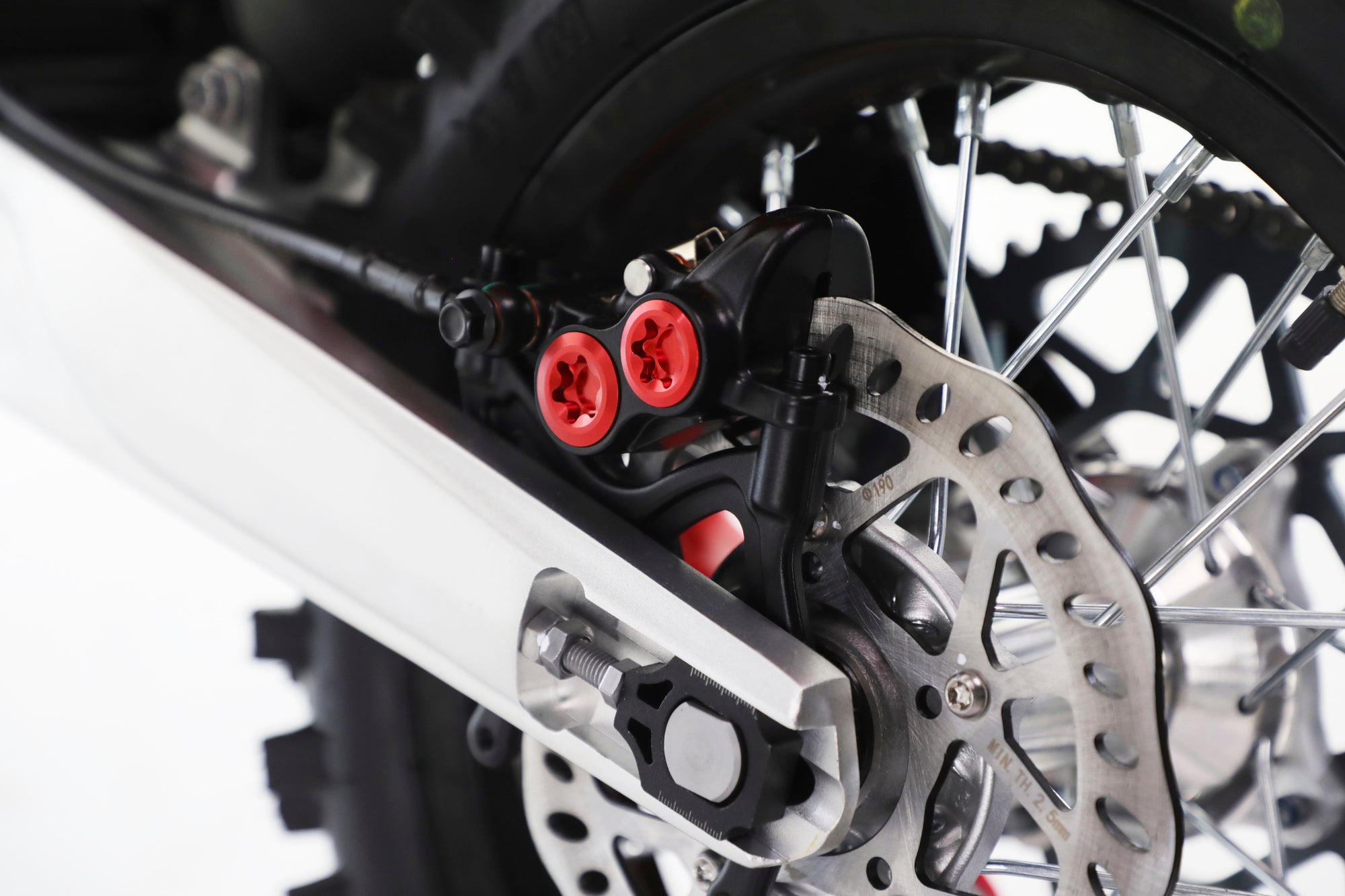 Front: 19″ motocross tyre - Rear: 16″ motocross tyre — MX-style tyres for off-road traction.