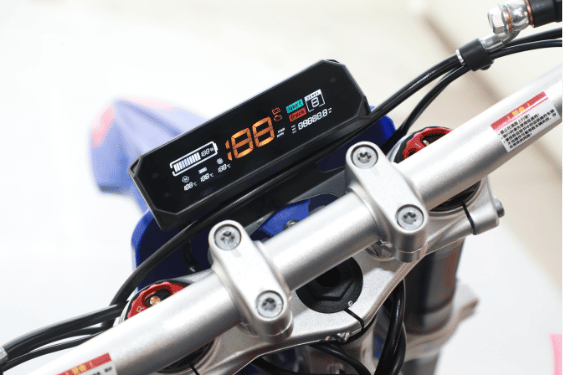 It’s built more like a serious small motocross bike than a toy: dealers commonly list 43mm USD forks and a heavy-duty swingarm, which helps it feel planted over braking bumps and rough trail chatter. One UK spec listing also calls out the bike weighing ~86kg, which can make it feel easier to place and turn compared with heavier petrol options at similar pace.