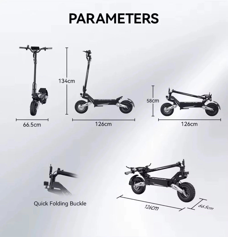 QUICK SUMMARY Built to conquer rough paths and city streets alike, the OOTD T10 blends a punchy 900W peak motor with a robust 48V 13.5Ah battery for real-world range up to 45 km. With 11" off-road tyres, dual suspension and front/rear disc brakes, it rides planted and stops with confidence. A wide 50×23 cm deck, 150 kg max load and fast 3A charging make it a practical daily workhorse as well as a weekend explorer.